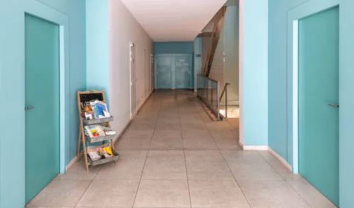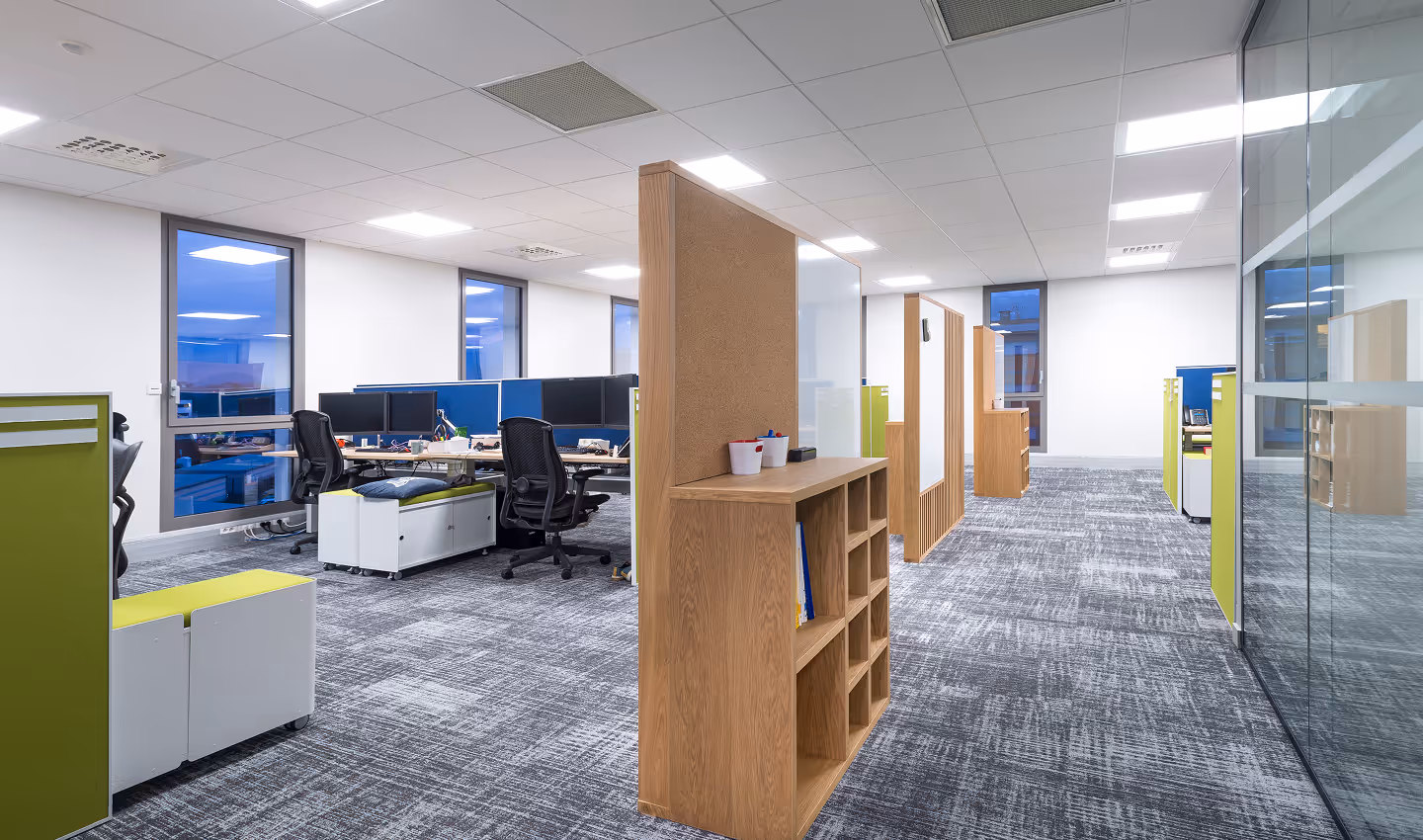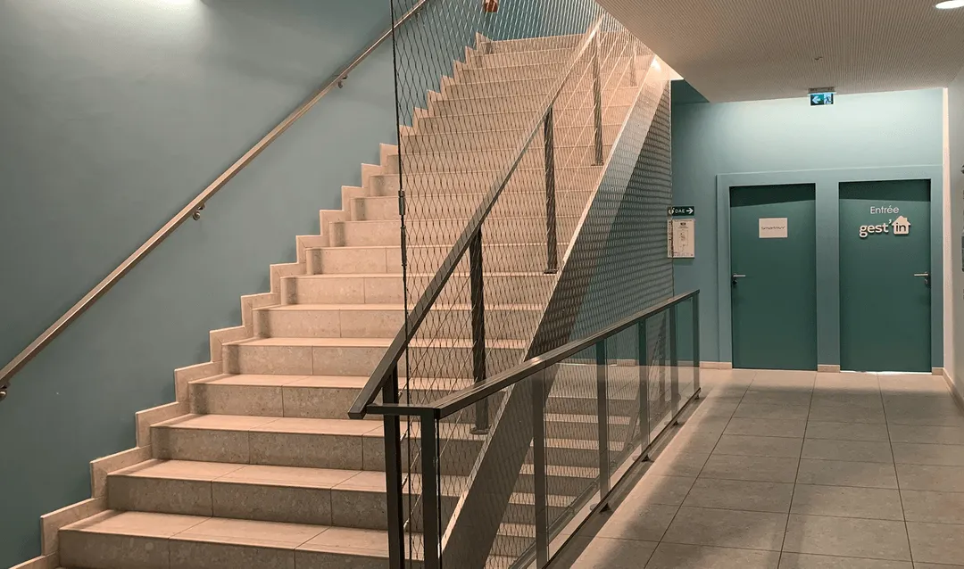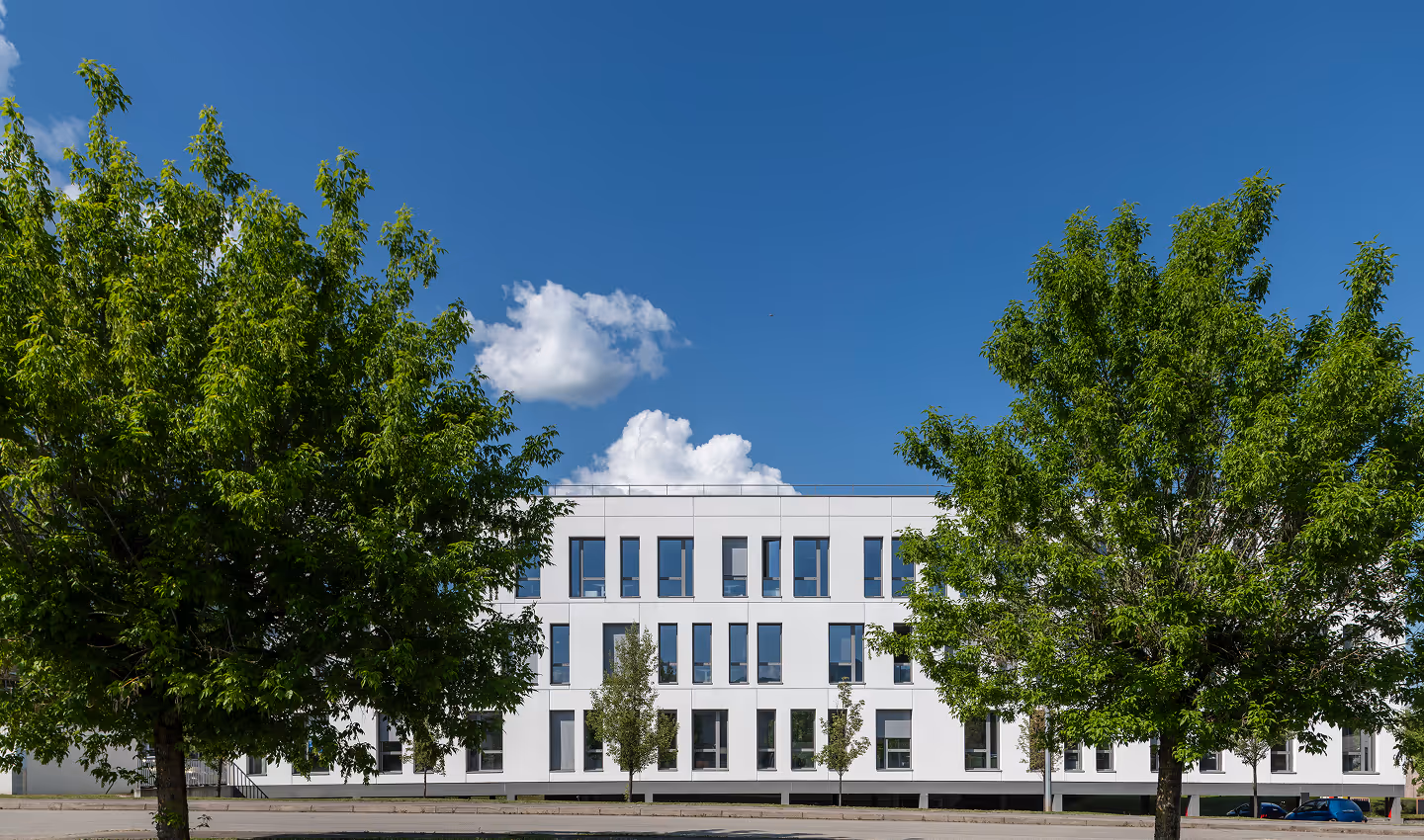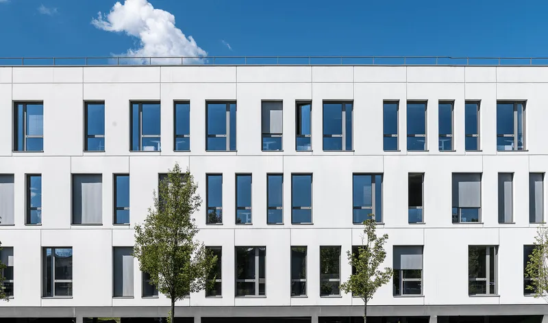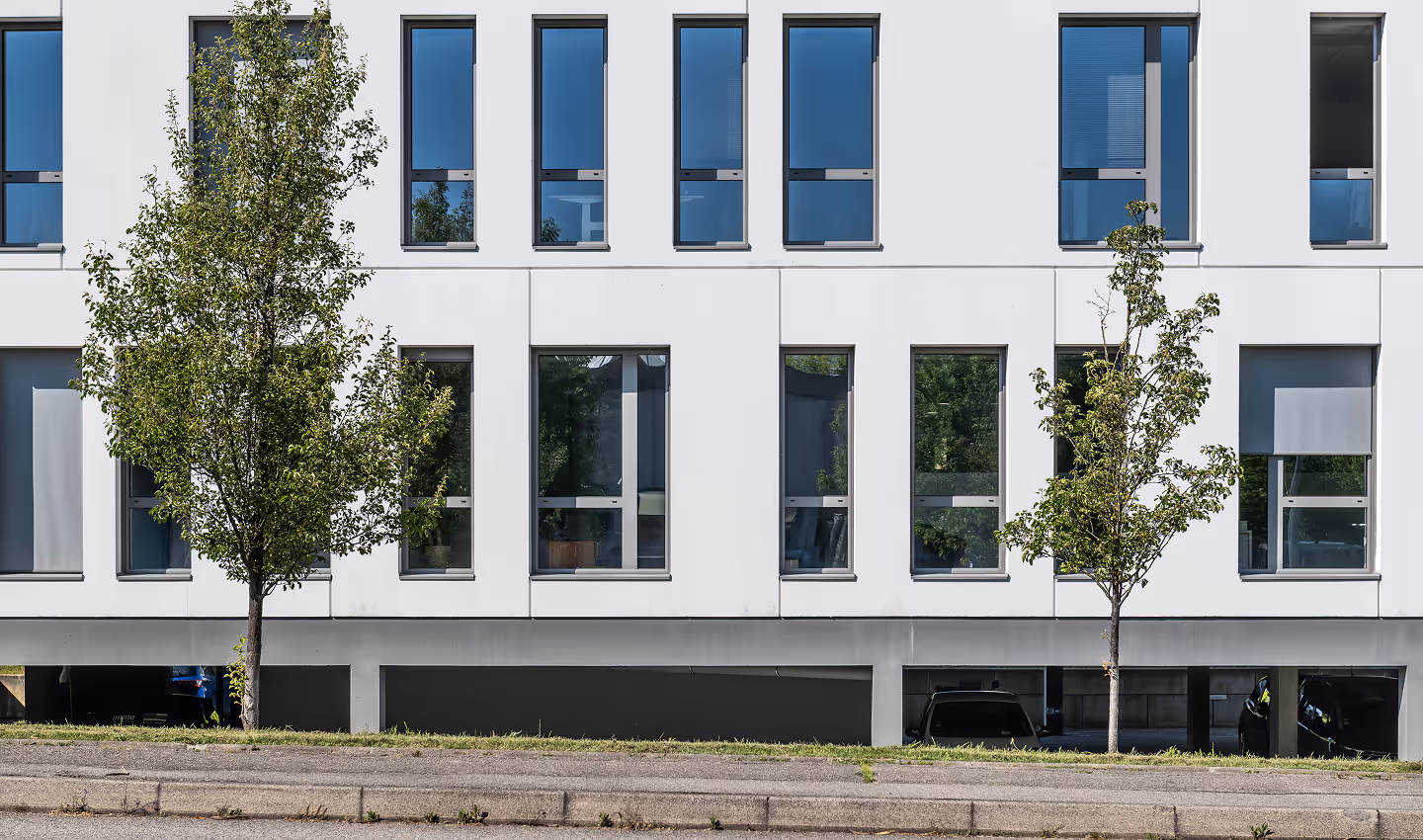 Ses façades minérales ménagent des ouvertures rythmées respectant une trame fixe imperceptible pour un non initié, permettant pour autant une flexibilité des aménagements intérieurs que ce soit en open-space ou en cloisonnement traditionnel sans tomber dans la monotonie d’une façade basique.