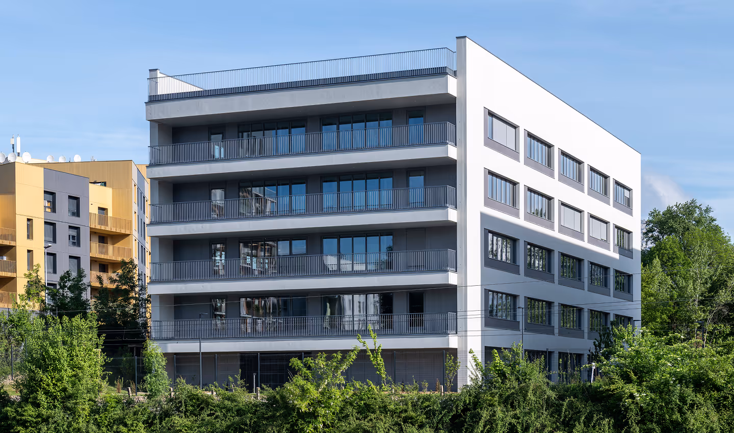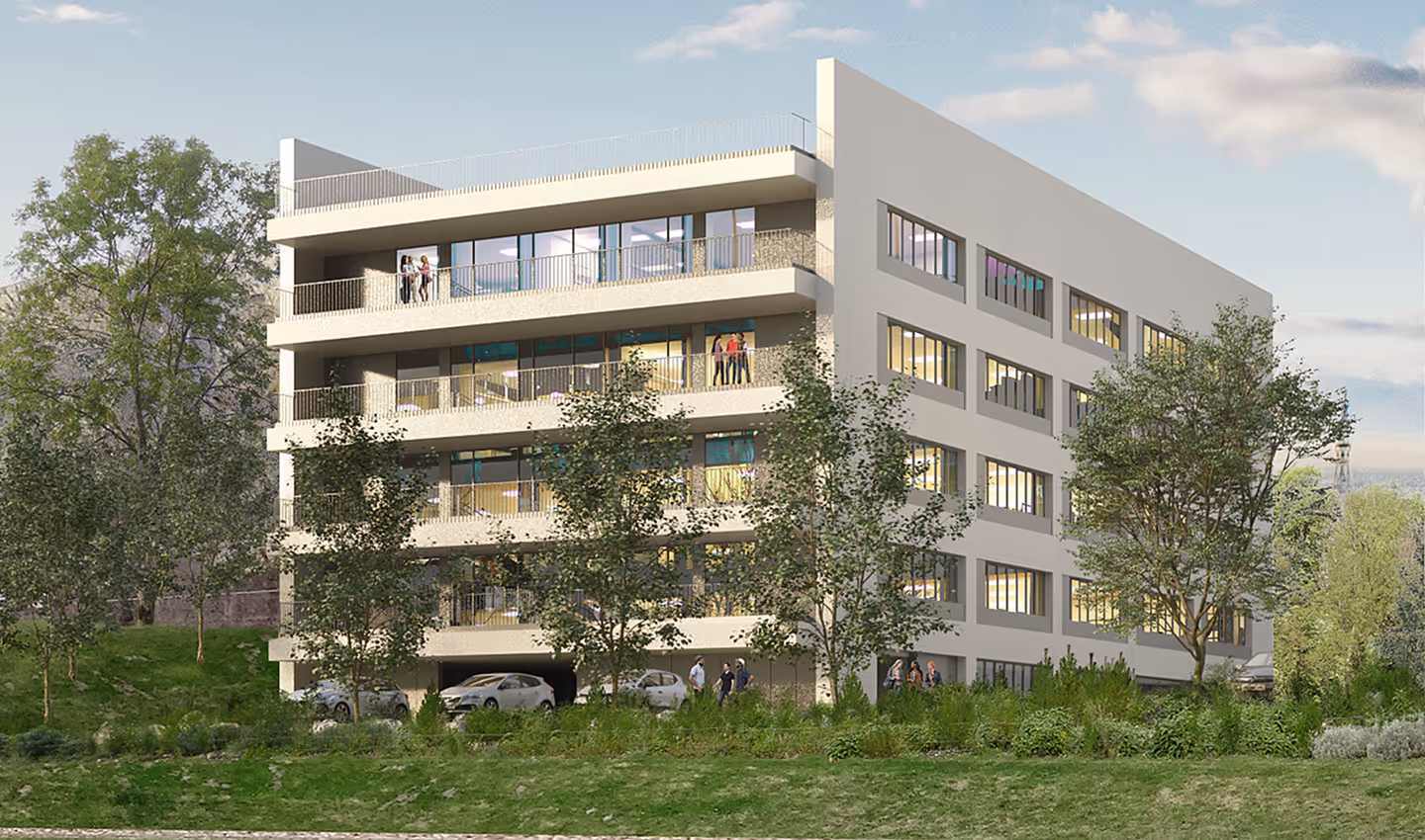La façade Sud d’Ypsilon, la plus exposée au soleil, a été conçue en prenant en compte aussi bien le confort d’été que la performance en hiver. Elle dispose de terrasses faisant office de masques solaires en été tout en permettant des apports solaires en hiver qui chaufferont naturellement le bâtiment.